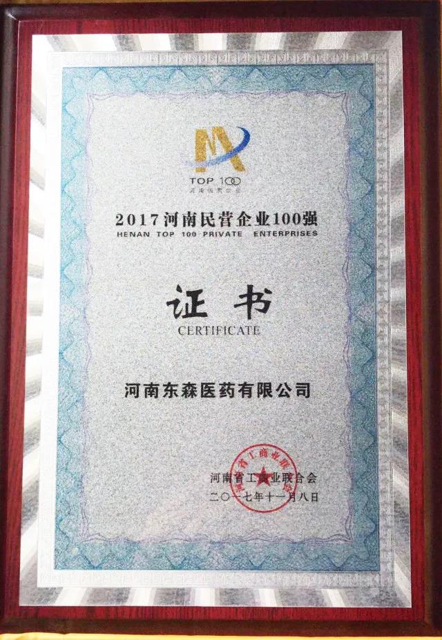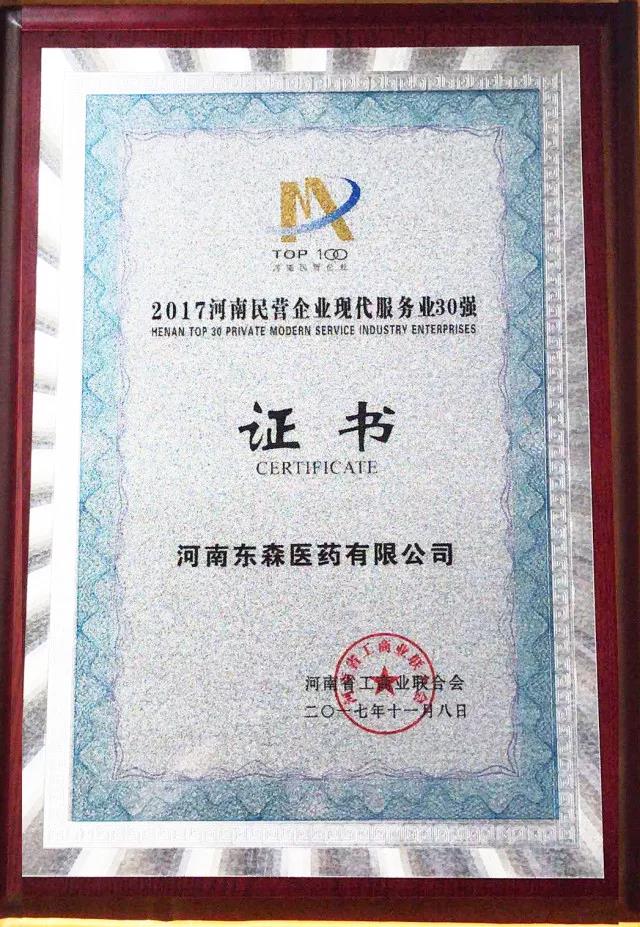 東森醫(yī)藥榮膺“2017河南民營企業(yè)100強”及“2017河南民營企業(yè)現(xiàn)代服務業(yè)30強”兩項大獎。