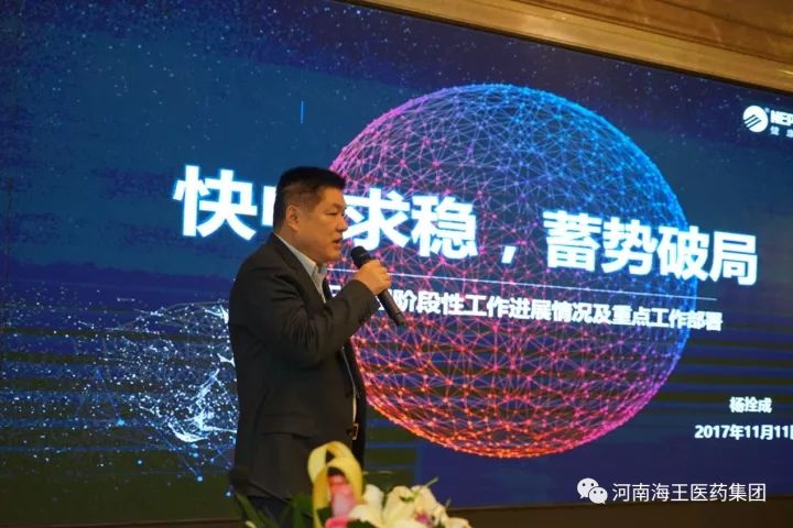 會上,楊拴成總裁作《快中求穩(wěn),蓄勢破局——河南海王集團階段性工作進展情況及重點工作部署》的主題報告,并從組織架構、戰(zhàn)略布局、模式創(chuàng)新、建章立制等方面,對2017年河南海王醫(yī)藥集團的階段性工作進展進行了全面梳理和介紹,同時對統(tǒng)籌資金匹配、投資并購、品種代理、營銷創(chuàng)新、全渠道供應鏈等各項重點工作進行了部署。