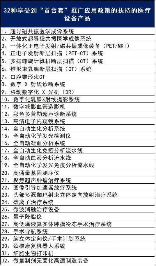 依據(jù)工信部最新發(fā)布的2017年版《首臺(套)重大技術裝備推廣應用指導目錄》,共有32種醫(yī)療設備產品可以享受到“首臺套”推廣應用政策的扶持。
