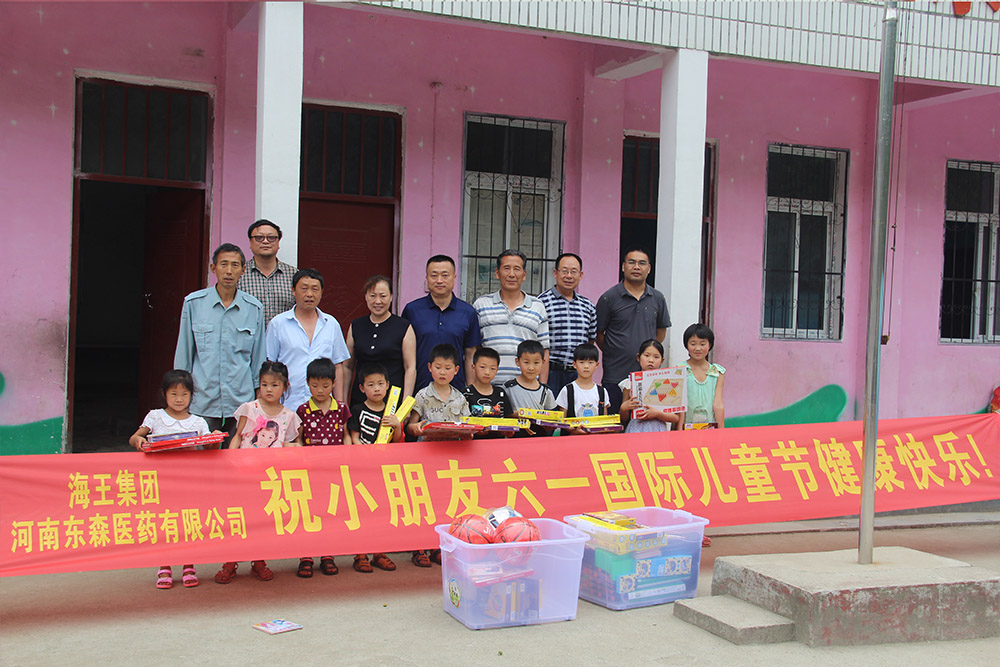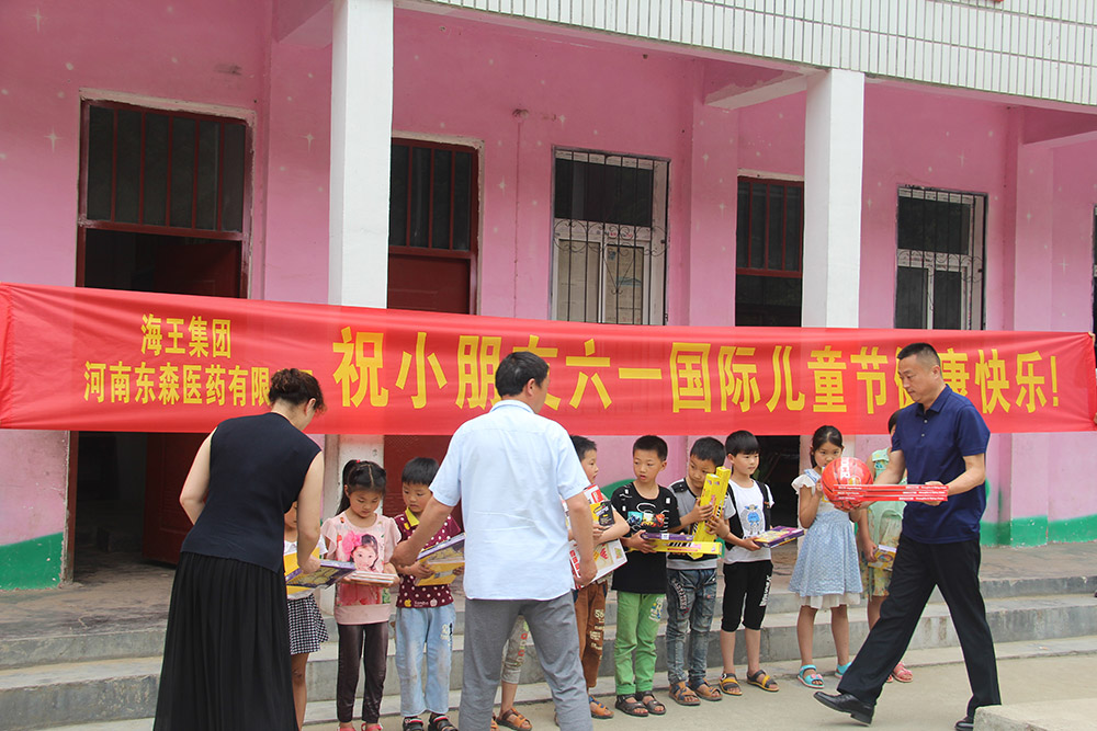 2017年6月1日上午,由海王集團河南東森醫(yī)藥有限公司總經(jīng)理助理閆玉姣、銷售總監(jiān)楊林、部門經(jīng)理于龍一行人員帶著黎富永總經(jīng)理及領導班子和全體員工的囑托前往南召縣喬端鄉(xiāng)穆老莊村小學,開展“六一兒童節(jié)送愛心”主題活動,在村黨支部書記王志明的陪同下,給正在上學的小朋友帶來學習用品和體育器材等驚喜,并送上節(jié)日的祝福。